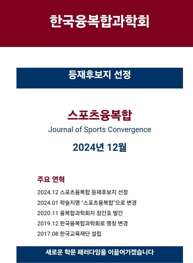 한국융복합과학회의 학술지 "스포츠융복합(Journal of Sports Convergence)"이 2024년 12월, 한국연구재단 등재후보지로 선정되었습니다.
